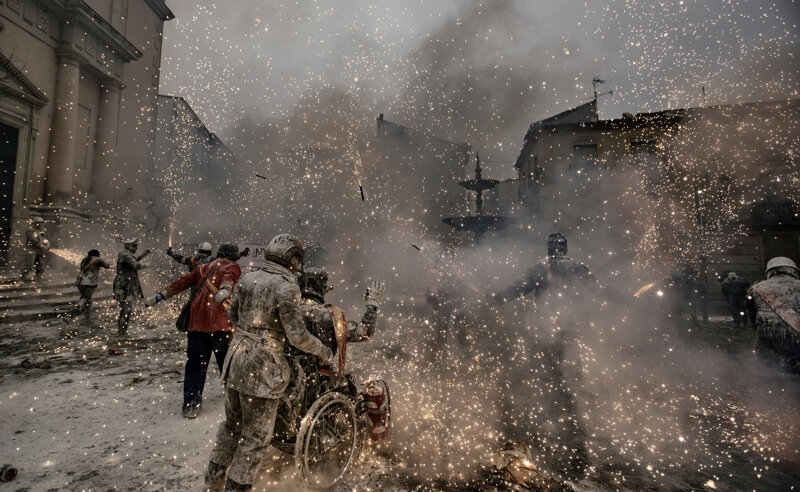 Each 28th december, in Ibi - province of Alicante, in Spain -, the "The floured's war" takes place. It's a festival in which the citizens are divided into two groups: the first is called the Enfarinat (the floured), that simulate a coup d'etat; the other one tries to calm down the rebellion. The teams plays with flour, water, eggs and coloured smoke bombs: the photos taken during the match are beautiful. It has been celebrated since 200 years and it's linked to the day of the massacre of innocents, when Herod, king of Judea, ordered to kill each baby in order to find Jesus.